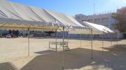 学校体育施設開放で運動場を使用している団体の皆さまには、夏休みから体育館やトイレの改修工事でご不便をかけていますが、運動会に向けてテントの設置し、トラックを引きました。