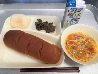 牛肉の香味焼き、トマトのスープスパゲッティ、なし(ニ十世紀)、黒糖パン、牛乳