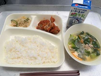 ヤンニョムチキン、豆腐のスープ、切干しだいこんのナムル、ごはん、牛乳