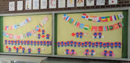 ミャクミャクが綱引きしている運動会バージョンの玄関掲示を3年生がつくってくれました。