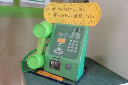 実物そっくりの公衆電話も制作してもらいました。身近に電話機がないので、『受話器』が分からない人もいます。