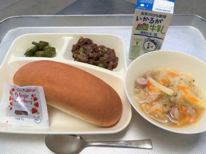 牛肉のデミグラスソース煮、ウインナーのスープ、きゅうりのピクルス、いちごジャム、コッペパン、牛乳