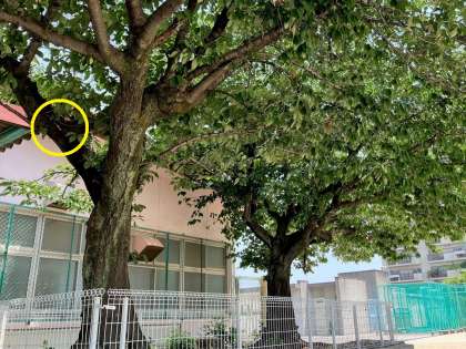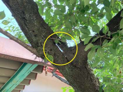 黄色の円で囲んだ部分に大きな亀裂があるので、安全のために枝を落とすことにしました。しかし、枝を切ると木のバランスがくずれ、木が倒れてしまうことが分かりました。