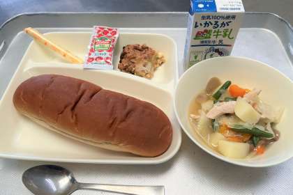 とうふローフ、ケチャップ(袋)、棒チーズ、洋風煮、黒糖パン、牛乳