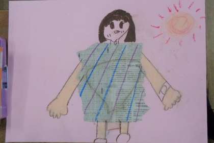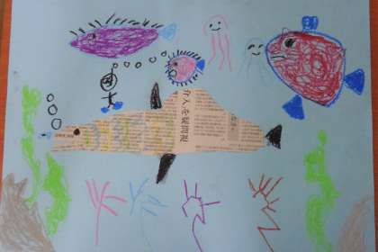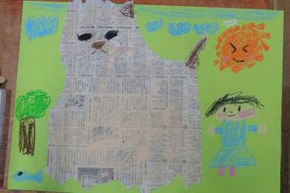 新聞紙をやぶいて、できた形から想像力を働かせて作品に仕上げました。
