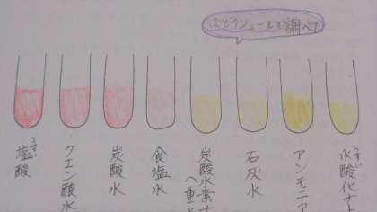 ぶどうジュースやアサガオの花から抽出した液を、いろいろな水溶液に加えて、色の変化を確かめました。