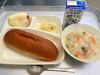 鶏肉とさつまいものシチュー、はくさいのピクルス、りんご、黒糖パン、牛乳