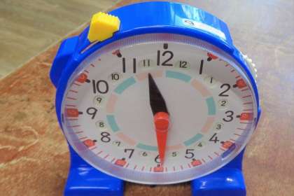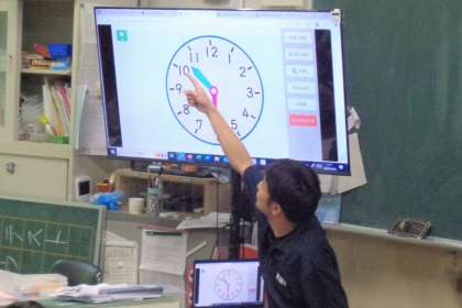 「なんじ・なんじはん」、時計のよみ方を練習しました。先生が指示した「〇時」や「〇時半」になるように、自分の時計の針を合わせます。