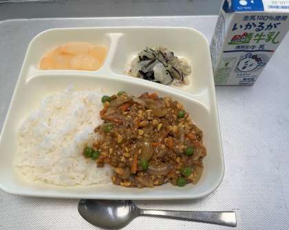 大豆入りキーマカレーライス、キャベツのひじきドレッシング、和なし(カット缶)