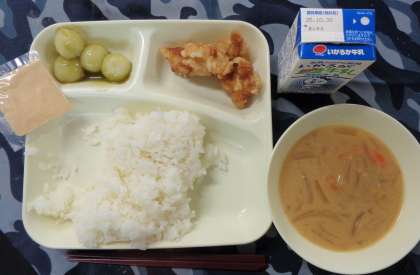 とり天〔大分〕、どさんこ汁〔北海道〕、抹茶団子〔京都〕、きな粉(袋)、ごはん、牛乳
