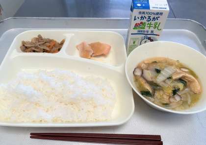 鶏肉のおろしじょうゆかけ、うすくず汁、きんぴらごぼう、ごはん、牛乳