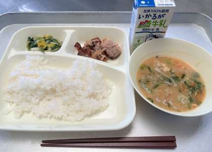 豚肉のしょうが焼き、さつまいものみそ汁、きくなとはくさいのごまあえ、ごはん、牛乳