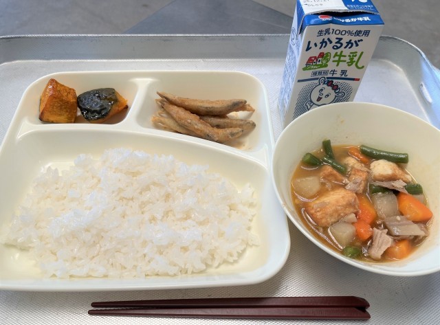 きびなごてんぷら、豚肉とあつあげの煮もの、焼きかぼちゃの甘みつかけ、ごはん、牛乳