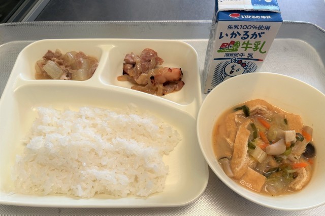 鶏肉の甘辛焼き、みそ汁、だいこんの煮もの、ごはん、牛乳