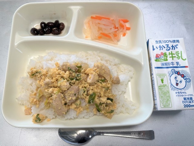 親子丼、紅白なます、黒豆の煮もの、牛乳(「おせち料理」に欠かせない紅白なます、黒豆の煮ものが出ました。また、卵アレルギーの人には、調理の最後に液卵を入れる前に、取り分けた卵が入っていない親子丼(?)を提供しました。)