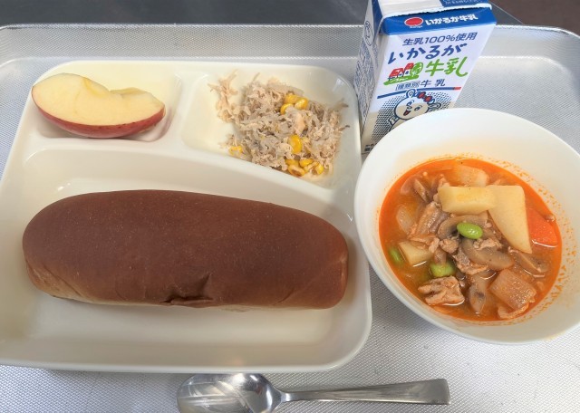 ケチャップ煮、ささみと野菜のソテー、りんご、黒糖パン、牛乳(大豆アレルギーの人には、むきえだまめを加えていない「ケチャップ煮」を提供しました。)