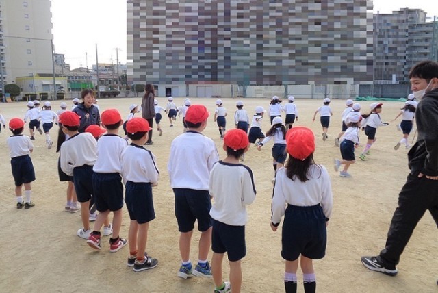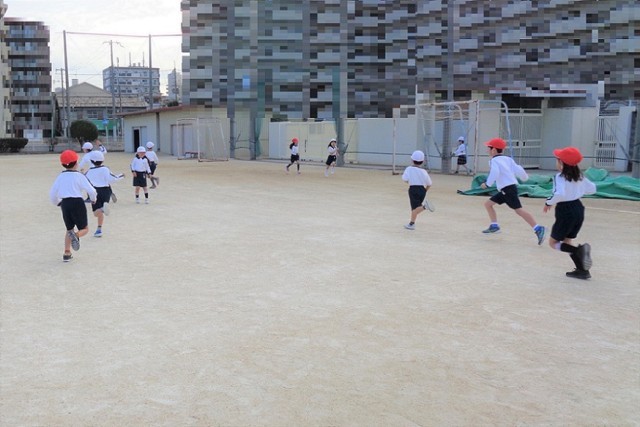 授業の最初に、体を温めるために「おにごっこ」をしました。赤帽のおには、生まれ月の順番に交替します。
