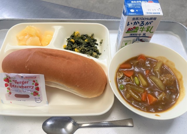 ミートボールと野菜のカレー煮、ツナとほうれんそうのソテー、パインアップル(カット缶)、いちごジャム、コッペパン、牛乳(大豆アレルギーの人には、えだまめを除いた「ミートボールと野菜のカレー煮」を提供しました。)