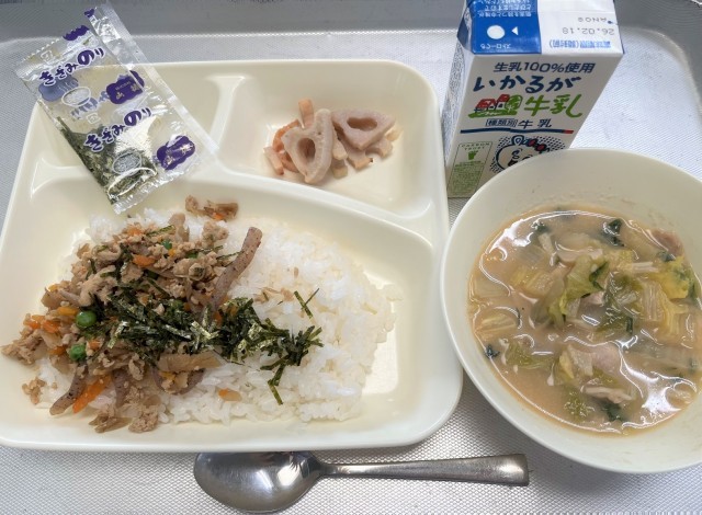 鶏ごぼうご飯、きざみのり(袋)、みそ汁、焼きれんこん、牛乳