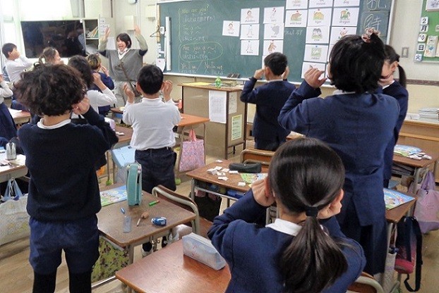 「ヘッド」「ノウズ」「イヤー」「マウス」、先生が発音した顔の部分を押さえます。