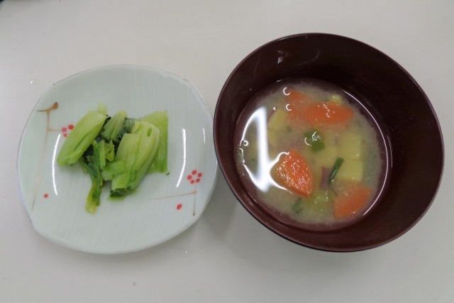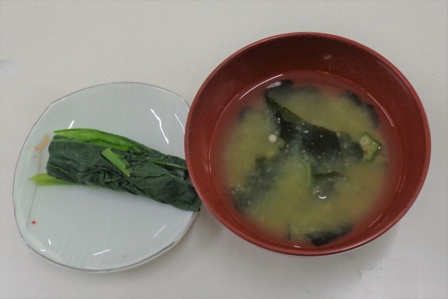 「みそ汁」の具は、ワカメ、オクラ、ニンジン、タマネギ、サツイモなど、各班で考えて入れます。どの班もおいしくできあがりました。