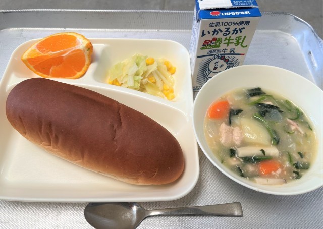 鶏肉とほうれんそうのシチュー、キャベツとコーンのサラダ、デコポン、黒糖パン、牛乳