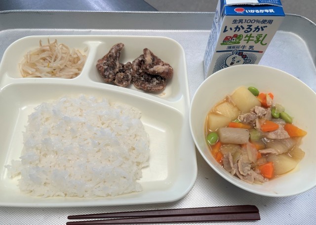 くじらのたつたあげ、豚肉とじゃがいもの煮もの、もやしの甘酢あえ、ごはん、牛乳