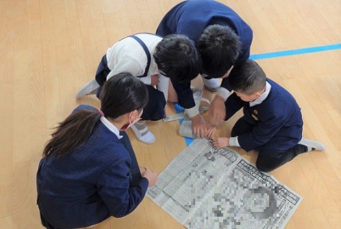 「新聞ちぎりゲーム」で交流しました。集会委員会のメンバーが、ゲームのルールを分かりやすく説明してくれました。新聞紙をりんごの皮むきのように、ちぎれないように細長く破っていき、その長さを競いました。