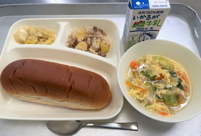 中華おこわ、卵スープ、キャベツのオイスターソースいため、黒糖パン、牛乳