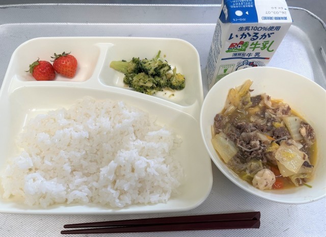 すき焼き煮、ブロッコリーのしょうがづけ、いちご、ごはん、牛乳