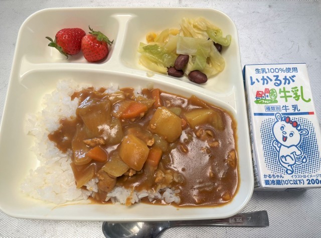 チキンカレーライス、金時豆と野菜のサラダ、いちご、牛乳