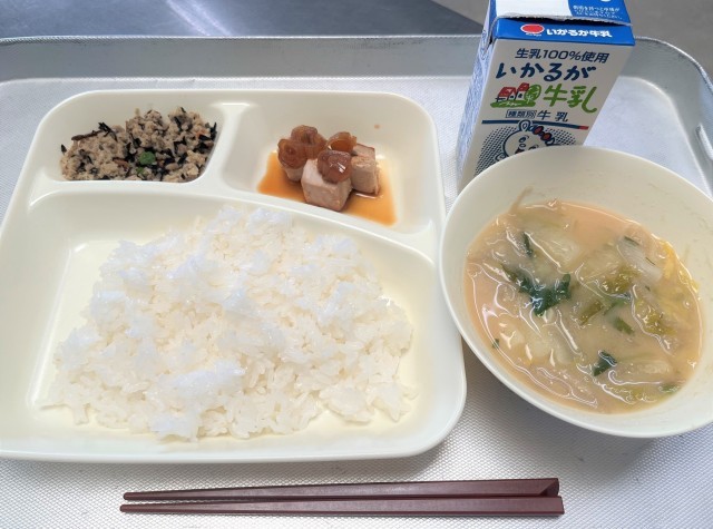 献立は、まぐろのねぎじょうゆかけ、みそ汁、高野どうふのいり煮、ごはん、牛乳