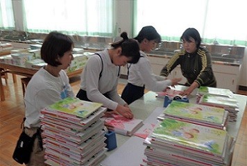 新6年生が、会場や1年教室周りの清掃、講堂のモップがけにいす並べ、配付する教科書の仕分け、教室の飾りつけ等、入学式の準備をしてくれました。