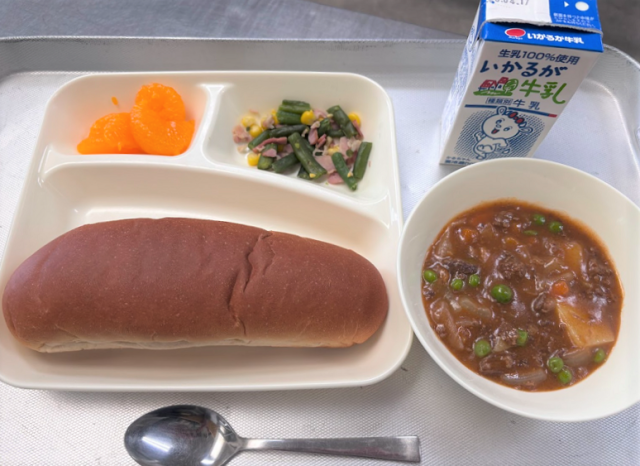 ビーフシチュー、ベーコンとさんどまめのソテー、みかん缶、黒糖パン、牛乳