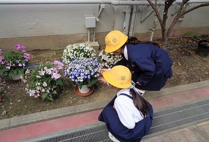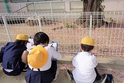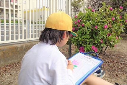 校庭で春をさがしました。見るだけでなく、手ざわり、かおりも確かめながら観察し、スケッチで記録しました。