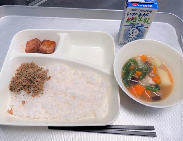 鶏肉とじゃがいもの煮もの、あつあげのしょうゆだれかけ、紅ざけそぼろ、ごはん、牛乳