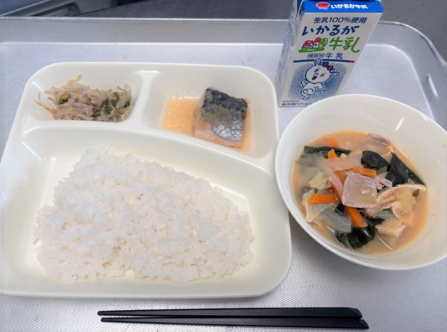 さごしのおろしじょうゆかけ、みそ汁、もやしとピーマンのいためもの、ごはん、牛乳