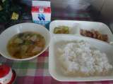 今日の給食は【鶏肉とじゃがいものスープ煮・きのこのドリア・ミニフィッシュ・ソフ...