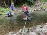 忍者体験の水蜘蛛体験です。川を渡り切る忍者は少ないです。