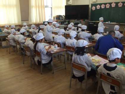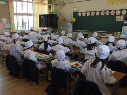 4月9日(火)1年生は入学して初めての給食です。みんな、おいしそうに食べています。