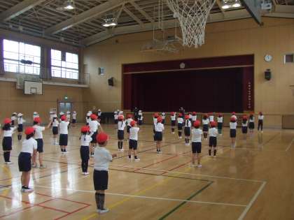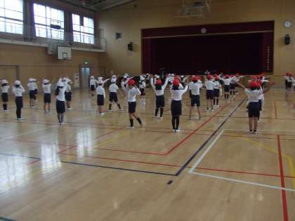 4月10日(水)2年生は体育館で体育の授業をしています。ラジオ体操を一所懸命やっています。