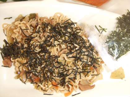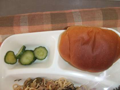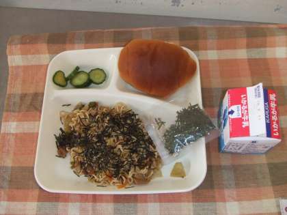 4月10日(水)の給食は焼きそば、キュウリのしょうがづけ、パン、牛乳です。焼きそばには豚肉、キャベツ、たまねぎ、ピーマン、ニンジンが入ってのりをかけて食べます。きゅうりのしょぷがづけはあっさり味です。おいしかったです。ごちそうさまでした。