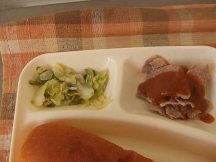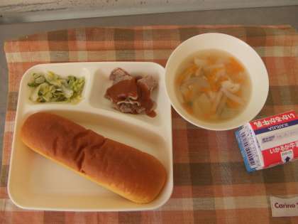 4月12日(金)の給食は豚肉のデミグラスソース、スープ、キャベツとピーマンのソテェー、パン、牛乳です。豚肉のデミグラスソースは豚肉にデミグラスソースの味がしっかり付いています。スープは鶏肉、じゃがいも、たまねぎ、ニンジンが入っています。キャベツとピーマンのソテェーはキャベツもピーマンも柔らかくあっさり味です。どれもおいしかったです。ごちそうさまでした。