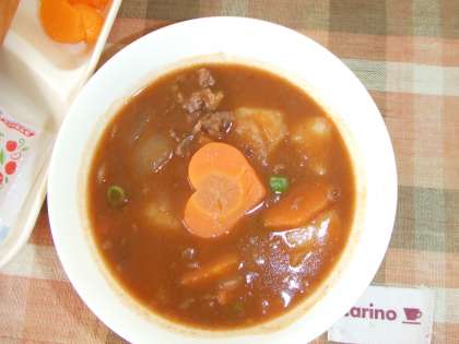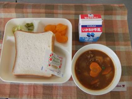 4月26日(金)の給食はビーフシチュー、キャベツンのピクルス、ミカン(缶)、リンゴジャム、パン、牛乳です。ビーフシチューはじゃがいも、たまねぎ、にんじん、グリンピースが入っています。とてもおいしかったです。キャベツのピクルスはさっぱり味でした。おいしかったです。ごちそうさまでした。