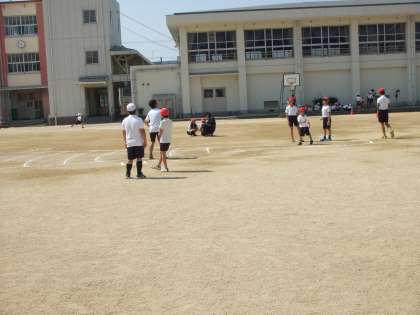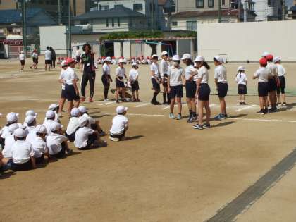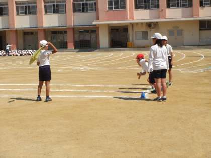 5月13日(月)1年生のスポーツテストです。6年生がお手伝いをしています。