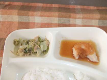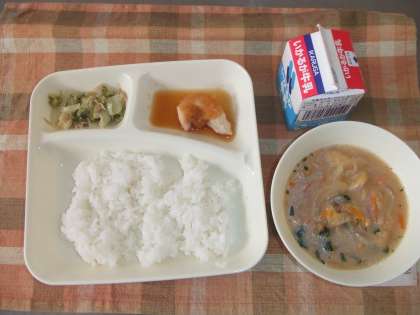 6月5日(水)の給食は鶏肉のおろしじょうゆかけ、味噌汁、野菜炒め、ごはん、牛乳です。鶏肉のおろしじょうゆかけはあっさり味です。味噌汁はうすあげ、玉ねぎ、もやし、ニンジン、だいこんばが入っています。野菜炒めはツナ缶詰、キャベツ、ピーマン、がはいっています。どれもごはんによく合いおいしかったです。ごちそうさまでした。