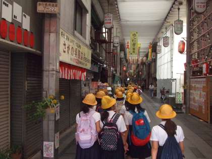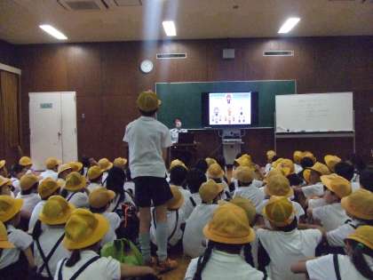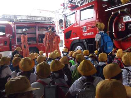 6月11日(火)4年生は平野消防署へ社会見学に行きました。商店街を通って消防署へ向かいました。消防車を見せてもらいました。