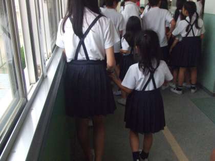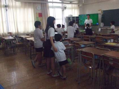 7月3日(水)地区班会を行いました。各班の班長さんが1年生を迎えに行っています。