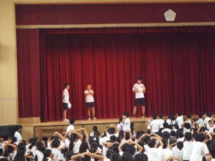 7月11日(木)児童集会の様子です。上の写真は卓球対決。下の写真ははやくち言葉対決です。楽しい時間を過ごしました。