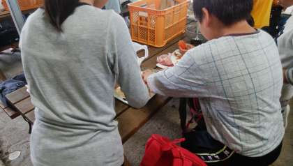 7月24日(水)飯盒炊さん、カレー作り。材料をきっています。うまく切れるかな。